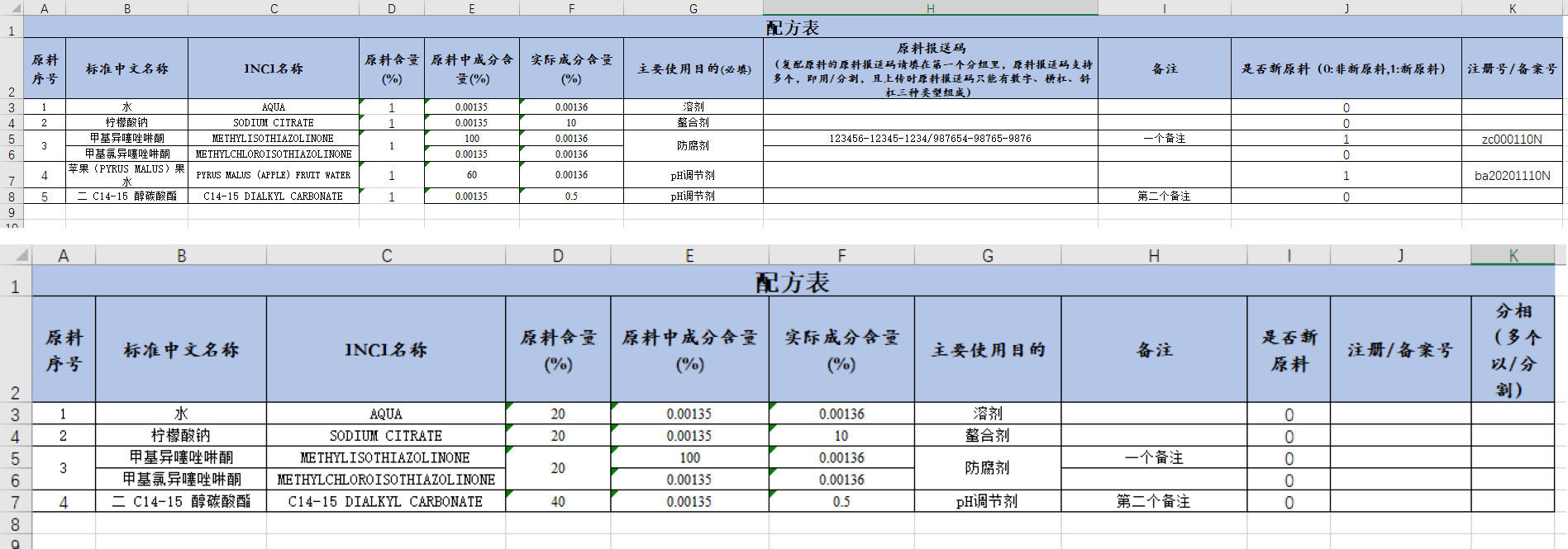 - 支持与普通化妆品备案管理系统和化妆品智慧申报审评系统配方导入模板格式一致的Excel配方。查看示例